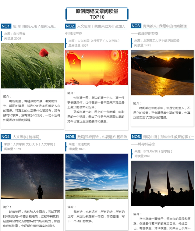 推进新媒体品牌栏目建设。学生工作处聘请了与学生工作相关部门的老师为特约撰稿人,积极撰写网络文章。在学生工作处微信公众平台上,每周推出“佳言就业”“心理小贴士”“周末安全”等品牌专栏,每月月初公布“北京理工大学学工系统原创网络文章排行榜”等评比项目,筹备建设网络思政深度报导特色栏目“北理瞭望”,力求打造一批有吸引力、有发展力、有影响力的新媒体品牌栏目。