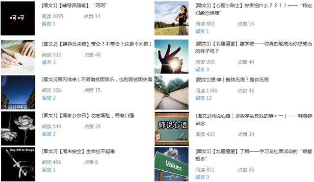 打造网络思想政治教育平台体系。在学生工作处的指导和规范下,各学院积极拓展网络平台,各学院党委副书记、辅导员积极参与网络文章撰写。本学期截至12月初,学生工作处和各学院在校院两级共23个微信公众平台上开设“青风徐来”“思·享”“生命之声”“师说心语”“人文思享”等思政类原创网文板块近50个,撰写原创网络文章累计超过200篇,阅读量达17万次。其中生命学院党委副书记刘晓俏、数学与统计学院党委副书记马晓宁、人文与社会科学学院党委副书记李冰、法学院党委副书记张爱秀等教师均参与网络文章撰写。