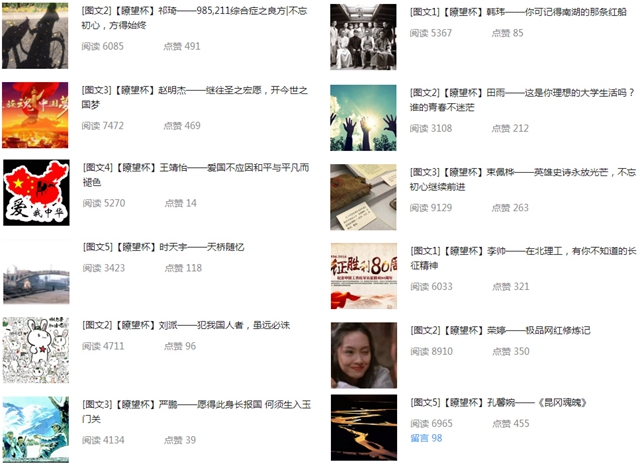 开展“瞭望杯”优秀网络文章大赛。2016年10月,学生工作处面向全校师生举办了“瞭望杯”2016年第1期优秀网络文章大赛。比赛涵盖理想信念教育、爱国主义教育、思想道德建设等9个主题。收录网络文章共计400余篇,文字累积超过60万字。在学生工作处微信公众平台推送的部分优秀作品,阅读量累计近15万次。目前2016年第2期“瞭望杯”比赛正在进行中。